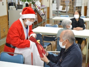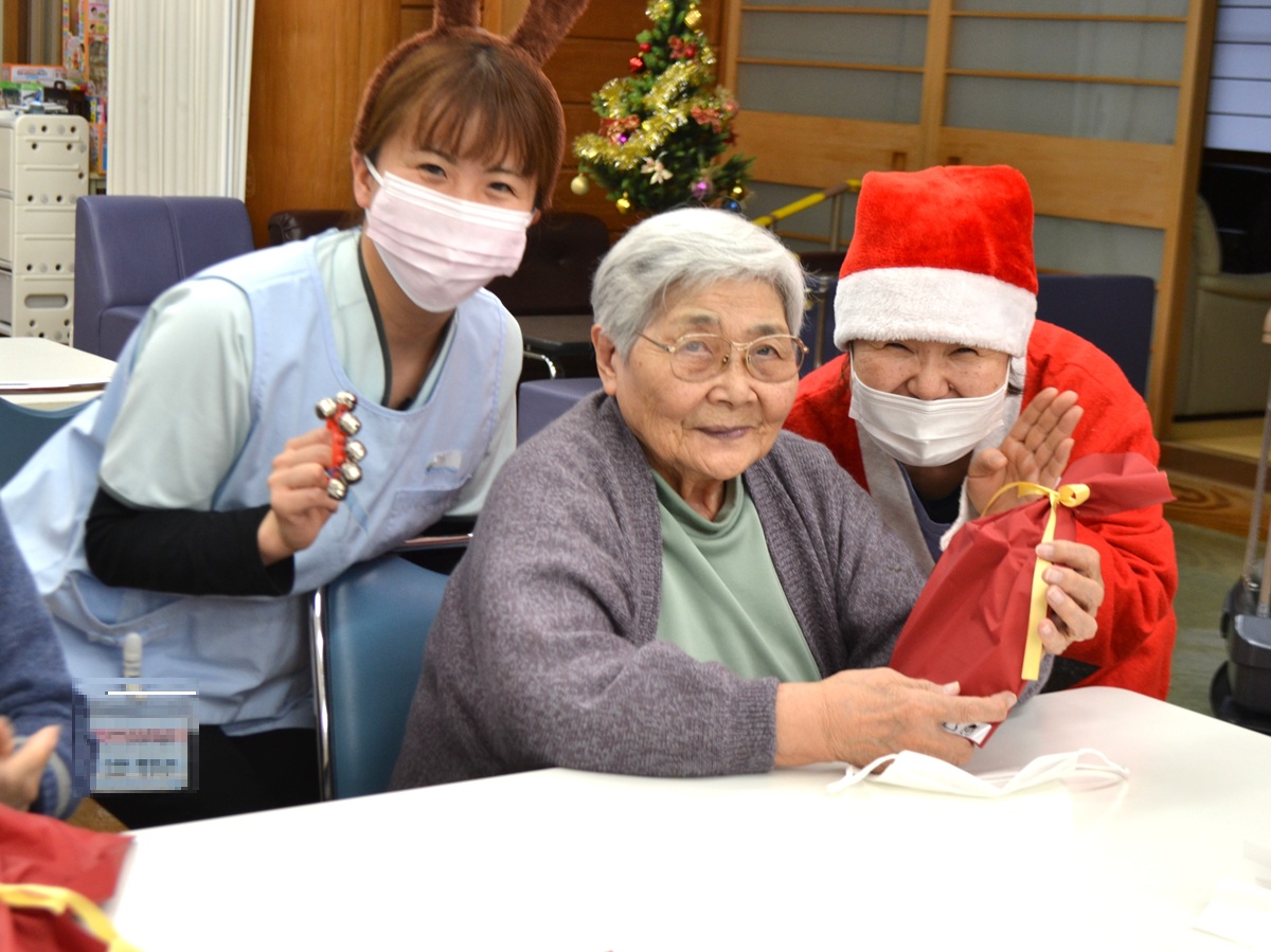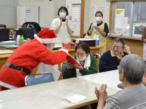 クリスマスといえばプレゼント!今年はサンタさんとトナカイがやってきました。軽快なクリスマスソングに合わせて、利用者の皆さま一人ひとりにラッピングバッグを渡します。受け取った皆さまからは素敵な笑顔がこぼれていました。