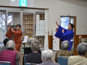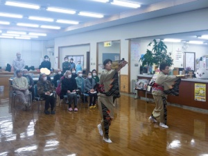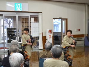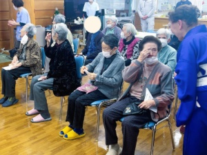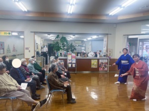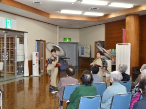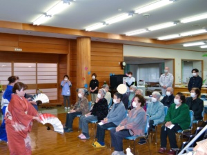 また今年はプレゼントとケーキのほかに、利用者様に楽しんでもらう催しものも。鏡芳会・鏡松会の皆さまによる日本舞踊披露会も行いました。