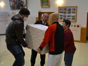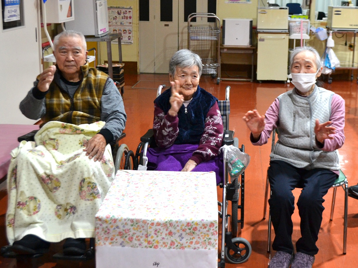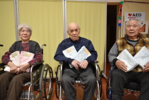 代表入居者の方へ当協議会会長よりお渡しします。施設の皆さまから「大切に使います」、「ありがとうございます」などの言葉がありました。