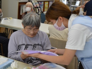 敬老の祝い品として、今年はフェイスタオルを準備。色とりどりの包装紙でラッピングしました。皆さん、どれにしようか真剣な眼差しで吟味します。受け取った後はさっそく中身を見て、大喜び!皆さんの目がキラキラしていたのが印象的です。